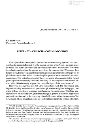 Słowa kluczowe: Internet , Cyberprzestrzeń , Kościół katolicki , Mass media - aspekt religijny