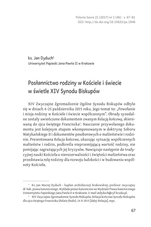 Posłannictwo rodziny w Kościele i świecie w świetle XIV Synodu BiskupówPosłannictwo rodziny w Kościele i świecie w świetle XIV Synodu Biskupów