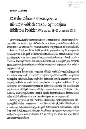 IX Walne Zebranie Biblistów Polskich oraz 50. Sympozjum Biblistów Polskich (Warszawa, 18-20 września 2012)IX Walne Zebranie Biblistów Polskich oraz 50. Sympozjum Biblistów Polskich (Warszawa, 18-20 września 2012)