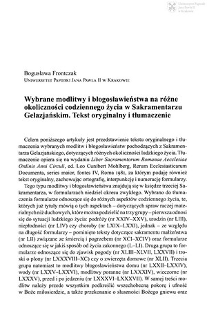 Wybrane modlitwy i błogosławieństwa na różne okoliczności codziennego życia w Sakramentarzu Gelazjańskim. Tekst oryginalny i tłumaczenieWybrane modlitwy i błogosławieństwa na różne okoliczności codziennego życia w Sakramentarzu Gelazjańskim. Tekst oryginalny i tłumaczenie