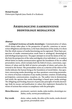 Słowa kluczowe: Powinności , Wartości , Media , Etyka mediów , Osoba