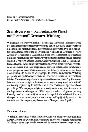 Słowa kluczowe: Hermeneutyka biblijna , Pieśń nad Pieśniami - krytyka i interpretacja , Alegoria , Grzegorz I (papież ; ca 540-604) , Ojcowie Kościoła