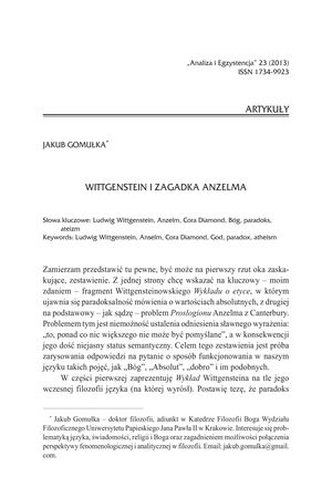 Słowa kluczowe: Wittgenstein, Ludwig (1889-1951) - krytyka i interpretacja , Anzelm z Canterbury (1033-1109) - krytyka i interpretacja , Cora Diamond , Bóg , Paradoks , Ateizm