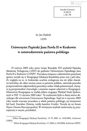 Uniwersytet Papieski Jana Pawła II w Krakowie w ustawodawstwie państwa polskiegoUniwersytet Papieski Jana Pawła II w Krakowie w ustawodawstwie państwa polskiego