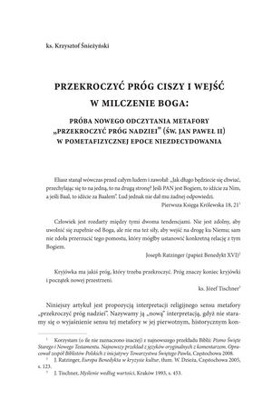 Przekroczyć próg ciszy i wejść w Milczenie Boga : próba nowego odczytania metafory „przekroczyć próg nadziei” (św. Jan Paweł II) w pometafizycznej epoce niezdecydowaniaPrzekroczyć próg ciszy i wejść w Milczenie Boga : próba nowego odczytania metafory „przekroczyć próg nadziei” (św. Jan Paweł II) w pometafizycznej epoce niezdecydowania