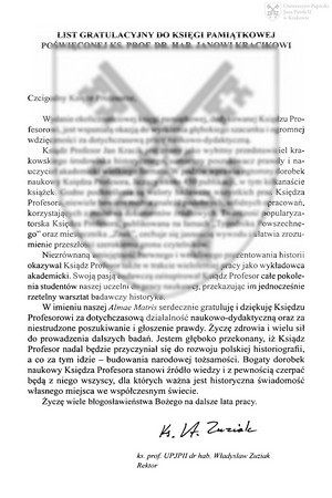 List gratulacyjny do księgi pamiątkowej poświęconej ks. prof. dr. hab. Janowi KracikowiList gratulacyjny do księgi pamiątkowej poświęconej ks. prof. dr. hab. Janowi Kracikowi