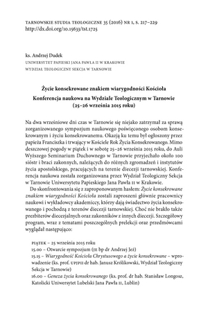 Życie konsekrowane znakiem wiarygodności Kościoła Konferencja naukowa na Wydziale Teologicznym w Tarnowie (25–26 września 2015 roku)Życie konsekrowane znakiem wiarygodności Kościoła Konferencja naukowa na Wydziale Teologicznym w Tarnowie (25–26 września 2015 roku)