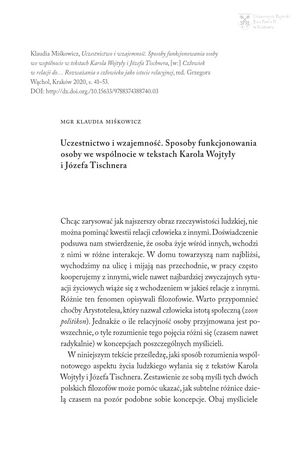 Uczestnictwo i wzajemność : sposoby funkcjonowania osoby we wspólnocie w tekstach Karola Wojtyły i Józefa TischneraUczestnictwo i wzajemność : sposoby funkcjonowania osoby we wspólnocie w tekstach Karola Wojtyły i Józefa Tischnera
