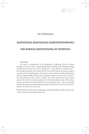 Słowa kluczowe: Filozofia cierpienia , Metoda fenomenologiczna , Znęcanie się , Szacunek , Samobójstwo , Sens życia , Nadzieja