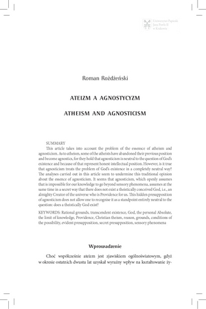 Słowa kluczowe: Ateizm , Agnostycyzm , Bóg , Istnienie transcendentne , Absolut osobowy , Granica poznania , Opatrzność Boża , Teizm chrześcijański , Rozum , Zjawiska zmysłowe