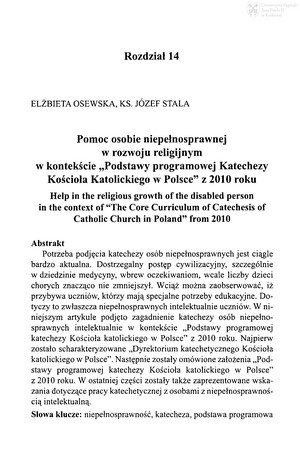 Pomoc osobie niepełnosprawnej w rozwoju religijnym w kontekście "Podstawy programowej Katechezy Kościoła Katolickiego w Polsce" z 2010 rokuPomoc osobie niepełnosprawnej w rozwoju religijnym w kontekście "Podstawy programowej Katechezy Kościoła Katolickiego w Polsce" z 2010 roku