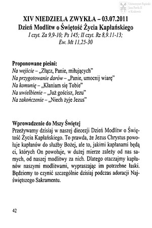 XIV niedziela zwykła - 03.07.2011 : Dzień Modlitw o Świętość Życia KapłańskiegoXIV niedziela zwykła - 03.07.2011 : Dzień Modlitw o Świętość Życia Kapłańskiego