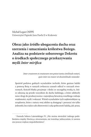 Obraz jako źródło ubogacenia ducha oraz szerzenie i umacniania królestwa Bożego. Analiza na podstawie soborowego Dekretu o środkach społecznego przekazywania myśli "Inter mirifica"Obraz jako źródło ubogacenia ducha oraz szerzenie i umacniania królestwa Bożego. Analiza na podstawie soborowego Dekretu o środkach społecznego przekazywania myśli "Inter mirifica"