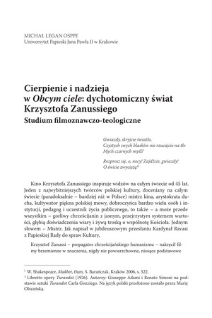 Cierpienie i nadzieja w Obcym ciele: dychotomiczny świat Krzysztofa Zanussiego. Studium filmoznawczo-teologiczneCierpienie i nadzieja w Obcym ciele: dychotomiczny świat Krzysztofa Zanussiego. Studium filmoznawczo-teologiczne