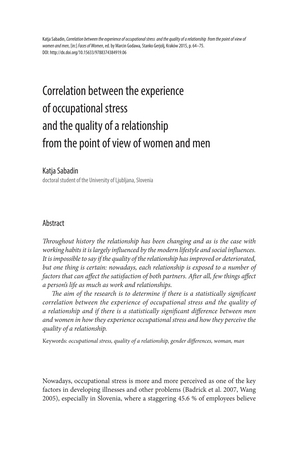 Correlation between the experience of occupational stress and the quality of a relationship from the point of view of women and menCorrelation between the experience of occupational stress and the quality of a relationship from the point of view of women and men