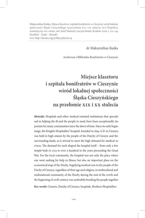 Miejsce klasztoru i szpitala bonifratrów w Cieszynie wśród lokalnej społeczności Śląska Cieszyńskiego na przełomie XIX i XX stuleciaMiejsce klasztoru i szpitala bonifratrów w Cieszynie wśród lokalnej społeczności Śląska Cieszyńskiego na przełomie XIX i XX stulecia